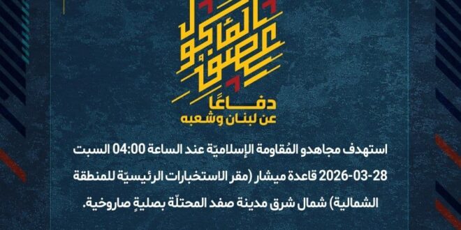 دفاعًا عن لبنان وشعبه، استهدف مجاهدو المُقاومة الإسلاميّة عند الساعة 04:00 السبت 28-03-2026 قاعدة ميشار (مقر الاستخبارات الرئيسيّة للمنطقة الشمالية) شمال شرق مدينة صفد المحتلّة بصليةٍ صاروخية.
