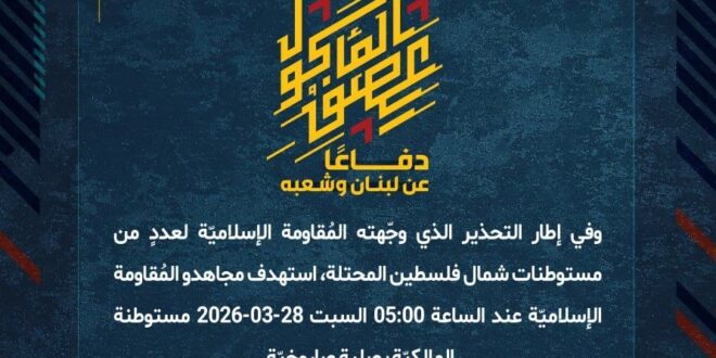 دفاعًا عن لبنان وشعبه، وفي إطار التحذير الذي وجّهته المُقاومة الإسلاميّة لعددٍ من مستوطنات شمال فلسطين المحتلة، استهدف مجاهدو المُقاومة الإسلاميّة عند الساعة 05:00 السبت 28-03-2026 مستوطنة المالكيّة بصليةٍ صاروخيّة.