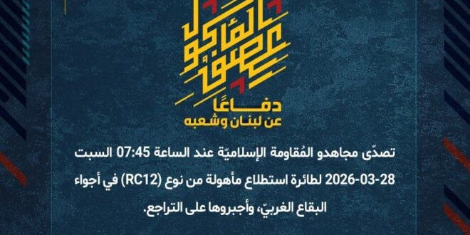 دفاعًا عن لبنان وشعبه، تصدّى مجاهدو المُقاومة الإسلاميّة عند الساعة 07:45 السبت 28-03-2026 لطائرة استطلاع مأهولة من نوع (RC12) في أجواء البقاع الغربيّ، وأجبروها على التراجع.