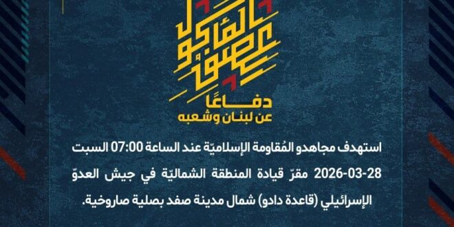 دفاعًا عن لبنان وشعبه، استهدف مجاهدو المُقاومة الإسلاميّة عند الساعة 07:00 السبت 28-03-2026 مقرّ قيادة المنطقة الشماليّة في جيش العدوّ الإسرائيلي (قاعدة دادو) شمال مدينة صفد بصلية صاروخية.