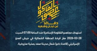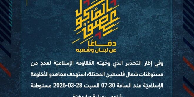 دفاعًا عن لبنان وشعبه، وفي إطار التحذير الذي وجّهته المُقاومة الإسلاميّة لعددٍ من مستوطنات شمال فلسطين المحتلة، استهدف مجاهدو المُقاومة الإسلاميّة عند الساعة 07:30 السبت 28-03-2026 مستوطنة شلومي بصليةٍ صاروخيّة.