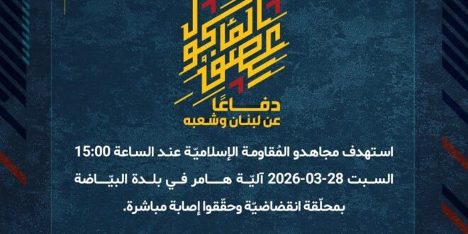 دفاعًا عن لبنان وشعبه، استهدف مجاهدو المُقاومة الإسلاميّة عند الساعة 15:00 السبت 28-03-2026 آليّة هامر في بلدة البيّاضة بمحلّقة انقضاضيّة وحقّقوا إصابة مباشرة.