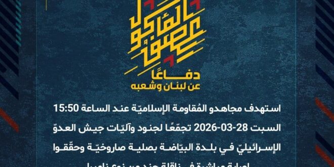 استهدف مجاهدو المُقاومة الإسلاميّة عند الساعة 15:50 السبت 28-03-2026 تجمّعًا لجنود وآليّات جيش العدوّ الإسرائيليّ في بلدة البيّاضة بصلية صاروخيّة وحقّقوا إصابة مباشرة في ناقلة جند من نوع ناميرا.