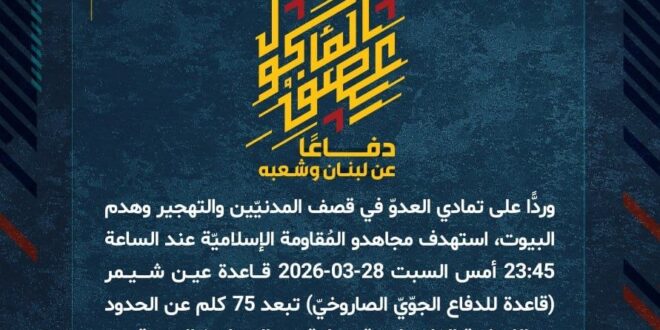 دفاعًا عن لبنان وشعبه، وردًّا على تمادي العدوّ في قصف المدنيّين والتهجير وهدم البيوت، استهدف مجاهدو المُقاومة الإسلاميّة عند الساعة 23:45 أمس السبت 28-03-2026 قـــاعدة عيــن شــــيــمر (قاعدة للدفاع الجوّيّ الصاروخيّ) تبعد 75 كلم عن الحدود اللبنانيّة الفلسطينيّة بصليةٍ من الصواريخ النوعيّة.