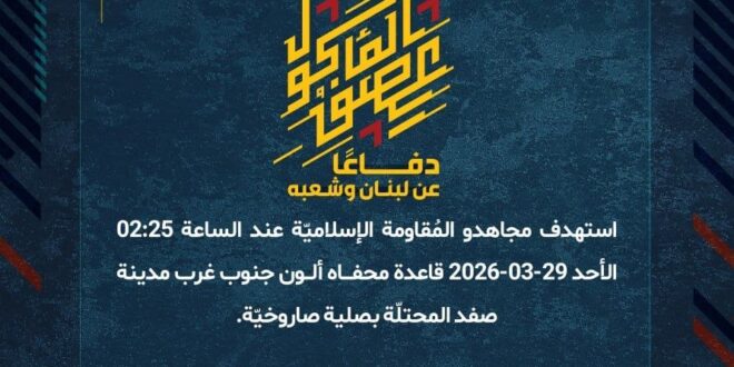 دفاعًا عن لبنان وشعبه، استهدف مجاهدو المُقاومة الإسلاميّة عند الساعة 02:25 الأحد 29-03-2026 قاعدة محفاه ألون جنوب غرب مدينة صفد المحتلّة بصلية صاروخيّة.