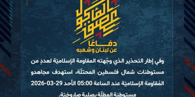 دفاعًا عن لبنان وشعبه، وفي إطار التحذير الذي وجّهته المقاومة الإسلاميّة لعددٍ من مستوطنات شمال فلسطين المحتلّة، استهدف مجاهدو المُقاومة الإسلاميّة عند الساعة 05:00 الأحد 29-03-2026 مستوطنة المطلّة بصلية صاروخيّة.