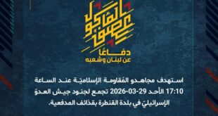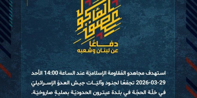 دفاعًا عن لبنان وشعبه، استهدف مجاهدو المُقاومة الإسلاميّة عند الساعة 14:00 الأحد 29-03-2026 تجمّعًا لجنود وآليّات جيش العدوّ الإسرائيليّ في خلّة الحجّة في بلدة عيترون الحدوديّة بصليةٍ صاروخيّة.