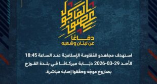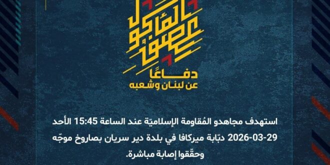 دفاعًا عن لبنان وشعبه، استهدف مجاهدو المُقاومة الإسلاميّة عند الساعة 15:45 الأحد 29-03-2026 دبّابة ميركافا في بلدة دير سريان بصاروخ موجّه وحقّقوا إصابة مباشرة.