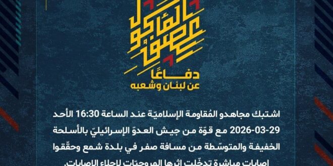 دفاعًا عن لبنان وشعبه، اشتبك مجاهدو المُقاومة الإسلاميّة عند الساعة 16:30 الأحد 29-03-2026 مع قوّة من جيش العدوّ الإسرائيليّ بالأسلحة الخفيفة والمتوسّطة من مسافة صفر في بلدة شمع وحقّقوا إصابات مباشرة تدخّلت إثرها المروحيّات لإجلاء الإصابات.