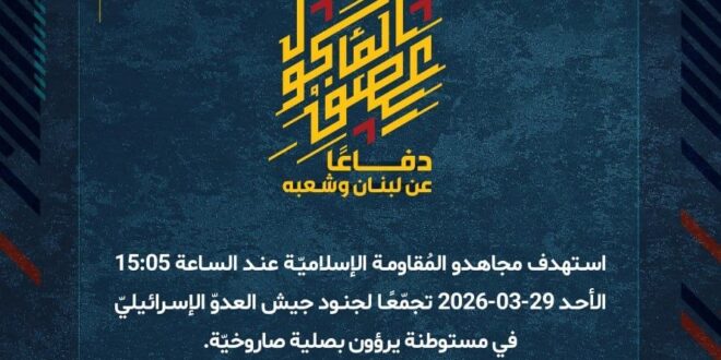 دفاعًا عن لبنان وشعبه، استهدف مجاهدو المُقاومة الإسلاميّة عند الساعة 15:05 الأحد 29-03-2026 تجمّعًا لجنود جيش العدوّ الإسرائيليّ في مستوطنة يرؤون بصلية صاروخيّة.