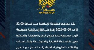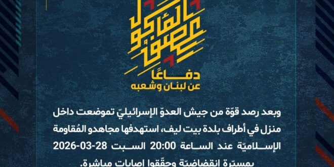 دفاعًا عن لبنان وشعبه، وبعد رصد قوّة من جيش العدوّ الإسرائيليّ تموضعت داخل منزل في أطراف بلدة بيت ليف، استهدفها مجاهدو المُقاومة الإسلاميّة عند الساعة 20:00 السبت 28-03-2026 بمسيّرة انقضاضيّة وحقّقوا إصابات مباشرة.