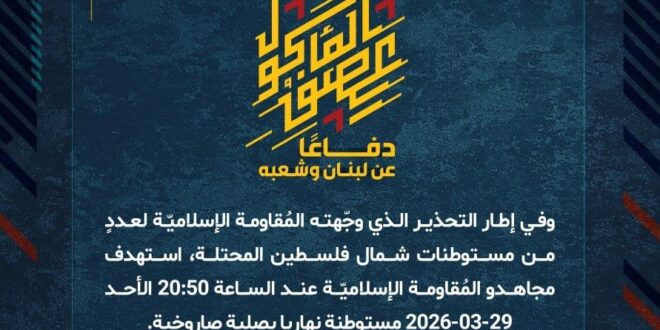 دفاعًا عن لبنان وشعبه، وفي إطار التحذير الذي وجّهته المُقاومة الإسلاميّة لعددٍ من مستوطنات شمال فلسطين المحتلة، استهدف مجاهدو المُقاومة الإسلاميّة عند الساعة 20:50 الأحد 29-03-2026 مستوطنة نهاريا بصلية صاروخية.