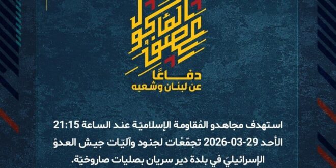 دفاعًا عن لبنان وشعبه، استهدف مجاهدو المُقاومة الإسلاميّة عند الساعة 21:15 الأحد 29-03-2026 تجمّعًات لجنود وآليّات جيش العدوّ الإسرائيليّ في بلدة دير سريان بصليات صاروخيّة.