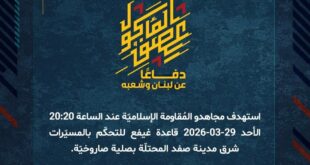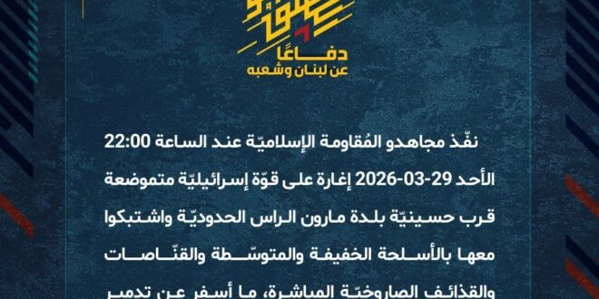 دفاعًا عن لبنان وشعبه، نفّذ مجاهدو المُقاومة الإسلاميّة عند الساعة 22:00 الأحد 29-03-2026 إغارة على قوّة إسرائيليّة متموضعة قرب حسينيّة بلدة مارون الراس الحدوديّة واشتبكوا معها بالأسلحة الخفيفة والمتوسّطة والقنّـــــاصات والقذائف الصاروخيّة المباشرة، ما أسفر عن تدمير دبّابة ميركافا ووقوع أفراد القوّة بين قتيل وجريح.