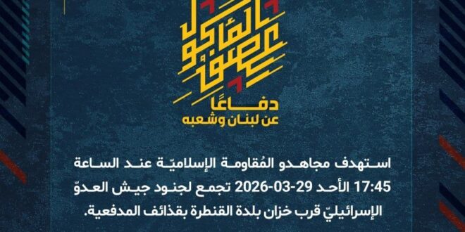 دفاعًا عن لبنان وشعبه، استهدف مجاهدو المُقاومة الإسلاميّة عند الساعة 17:45 الأحد 29-03-2026 تجمع لجنود جيش العدوّ الإسرائيليّ قرب خزان بلدة القنطرة بقذائف المدفعية.