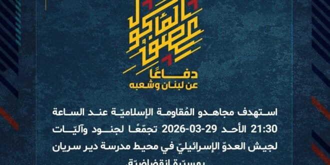دفاعًا عن لبنان وشعبه، استهدف مجاهدو المُقاومة الإسلاميّة عند الساعة 21:30 الأحد 29-03-2026 تجمّعًا لجنود وآليّات لجيش العدوّ الإسرائيليّ في محيط مدرسة دير سريان بمسيّرة انقضاضيّة.