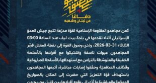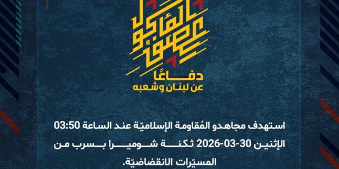 دفاعًا عن لبنان وشعبه، استهدف مجاهدو المُقاومة الإسلاميّة عند الساعة 03:50 الإثنين 30-03-2026 ثكنة شوميرا بسرب من المسيّرات الانقضاضيّة.