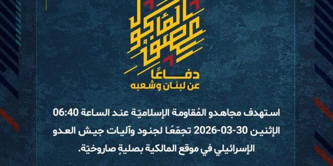 دفاعًا عن لبنان وشعبه، استهدف مجاهدو المُقاومة الإسلاميّة عند الساعة 06:40 الإثنين 30-03-2026 تجمّعًا لجنود وآليات جيش العدو الإسرائيلي في موقع المالكية بصليةٍ صاروخيّة.