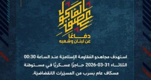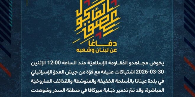 دفاعًا عن لبنان وشعبه، يخوض مجاهدو المُقاومة الإسلاميّة منذ الساعة 12:00 الإثنين 30-03-2026 اشتباكات عنيفة مع قوّة من جيش العدوّ الإسرائيليّ في بلدة عيناتا بالأسلحة الخفيفة والمتوسّطة والقذائف الصاروخيّة المباشرة، وقد تمّ تدمير دبّابة ميركافا في منطقة السدر وشوهدت تحترق، ولا تزال الاشتباكات مستمرّة حتى الساعة.