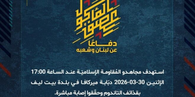 دفاعًا عن لبنان وشعبه، استهدف مجاهدو المُقاومة الإسلاميّة عند الساعة 17:00 الإثنين 30-03-2026 دبّابة ميركافا في بلدة بيت ليف بقذائف التاندوم وحقّقوا إصابة مباشرة.