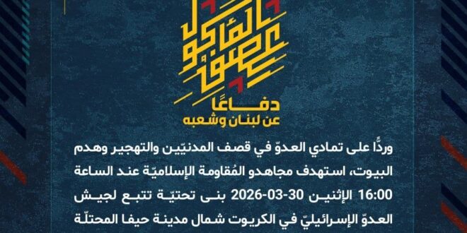 دفاعًا عن لبنان وشعبه، وردًّا على تمادي العدوّ في قصف المدنيّين والتهجير وهدم البيوت، استهدف مجاهدو المُقاومة الإسلاميّة عند الساعة 16:00 الإثنين 30-03-2026 بنى تحتيّة تتبع لجيش العدوّ الإسرائيليّ في الكريوت شمال مدينة حيفا المحتلّة بصليةٍ صاروخيّة.