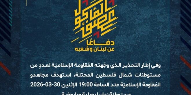 دفاعًا عن لبنان وشعبه، وفي إطار التحذير الذي وجّهته المُقاومة الإسلاميّة لعددٍ من مستوطنات شمال فلسطين المحتلة، استهدف مجاهدو المُقاومة الإسلاميّة عند الساعة 19:00 الإثنين 30-03-2026 مستوطنة نهاريا بصلية صاروخية.