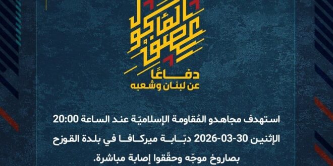 دفاعًا عن لبنان وشعبه، استهدف مجاهدو المُقاومة الإسلاميّة عند الساعة 20:00 الإثنين 30-03-2026 دبّابة ميركافا في بلدة القوزح بصاروخ موجّه وحقّقوا إصابة مباشرة.