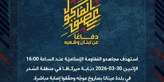 دفاعًا عن لبنان وشعبه، استهدف مجاهدو المُقاومة الإسلاميّة عند الساعة 16:00 الإثنين 30-03-2026 دبّابة ميركافا في منطقة السّدر في بلدة عيناتا بصاروخ موجّه وحقّقوا إصابة مباشرة.