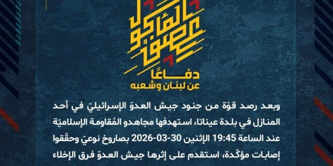 دفاعًا عن لبنان وشعبه، وبعد رصد قوّة من جنود جيش العدوّ الإسرائيليّ في أحد المنازل في بلدة عيناتا، استهدفها مجاهدو المُقاومة الإسلاميّة عند الساعة 19:45 الإثنين 30-03-2026 بصاروخ نوعيّ وحقّقوا إصابات مؤكّدة، استقدم على إثرها جيش العدوّ فرق الإخلاء لسحب الإصابات.