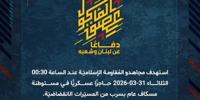 دفاعًا عن لبنان وشعبه، استهدف مجاهدو المُقاومة الإسلاميّة عند الساعة 00:30 الثلاثاء 31-03-2026 حاجزًا عسكريًّا في مستوطنة مسكاف عام بسرب من المسيّرات الانقضاضيّة.