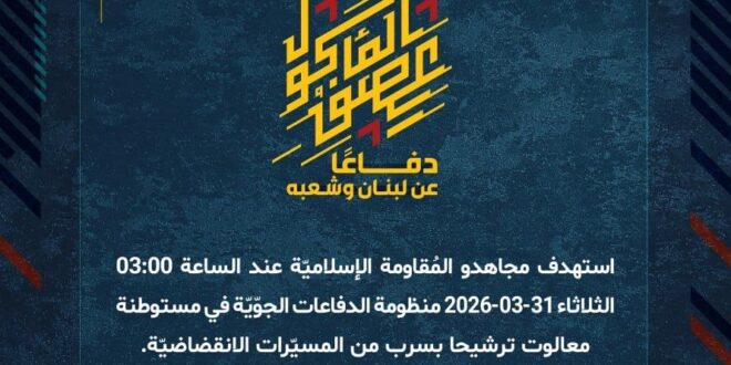 دفاعًا عن لبنان وشعبه، استهدف مجاهدو المُقاومة الإسلاميّة عند الساعة 03:00 الثلاثاء 31-03-2026 منظومة الدفاعات الجوّيّة في مستوطنة معالوت ترشيحا بسرب من المسيّرات الانقضاضيّة.