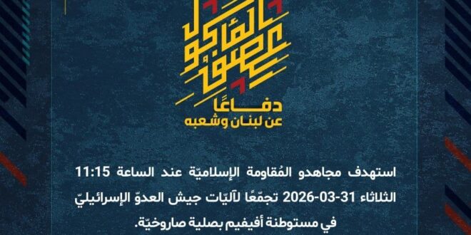 دفاعًا عن لبنان وشعبه، استهدف مجاهدو المُقاومة الإسلاميّة عند الساعة 11:15 الثلاثاء 31-03-2026 تجمّعًا لآليّات جيش العدوّ الإسرائيليّ في مستوطنة أفيفيم بصلية صاروخيّة.