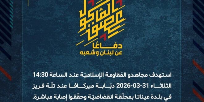 دفاعًا عن لبنان وشعبه، استهدف مجاهدو المُقاومة الإسلاميّة عند الساعة 14:30 الثلاثاء 31-03-2026 دبّابة ميركافا عند تلّة فريز في بلدة عيناتا بمحلّقة انقضاضيّة وحقّقوا إصابة مباشرة.