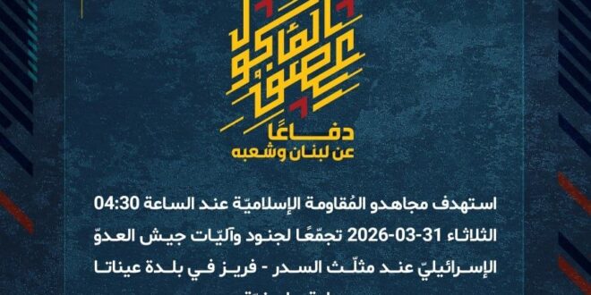 دفاعًا عن لبنان وشعبه، استهدف مجاهدو المُقاومة الإسلاميّة عند الساعة 04:30 الثلاثاء 31-03-2026 تجمّعًا لجنود وآليّات جيش العدوّ الإسرائيليّ عند مثلّث السدر – فريز في بلدة عيناتا بصلية صاروخيّة.