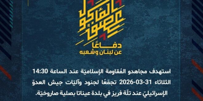 دفاعًا عن لبنان وشعبه، استهدف مجاهدو المُقاومة الإسلاميّة عند الساعة 14:30 الثلاثاء 31-03-2026 تجمّعًا لجنود وآليّات جيش العدوّ الإسرائيليّ عند تلّة فريز في بلدة عيناتا بصلية صاروخيّة.