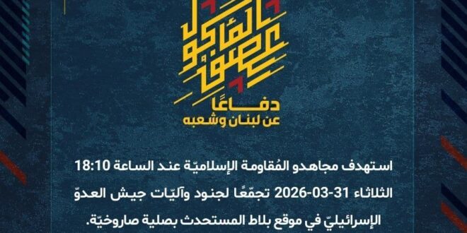 دفاعًا عن لبنان وشعبه، استهدف مجاهدو المُقاومة الإسلاميّة عند الساعة 18:10 الثلاثاء 31-03-2026 تجمّعًا لجنود وآليّات جيش العدوّ الإسرائيليّ في موقع بلاط المستحدث بصلية صاروخيّة.