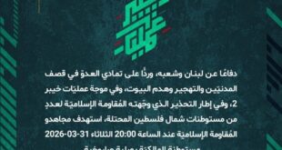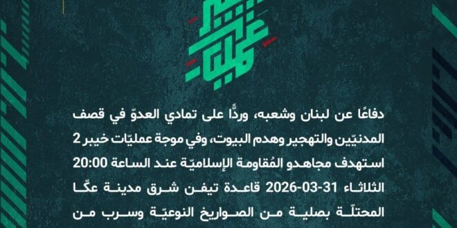 دفاعًا عن لبنان وشعبه، وردًّا على تمادي العدوّ في قصف المدنيّين والتهجير وهدم البيوت، وفي موجة عمليّات خيبر 2، استهدف مجاهدو المُقاومة الإسلاميّة عند الساعة 20:00 الثلاثاء 31-03-2026 قاعدة تيفن شرق مدينة عكّا المحتلّة بصلية من الصواريخ النوعيّة وسرب من المسيّرات الانقضاضيّة.