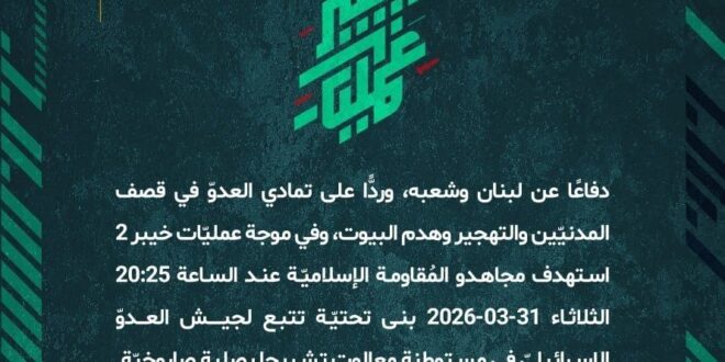 دفاعًا عن لبنان وشعبه، وردًّا على تمادي العدوّ في قصف المدنيّين والتهجير وهدم البيوت، وفي موجة عمليّات خيبر 2، استهدف مجاهدو المُقاومة الإسلاميّة عند الساعة 20:25 الثلاثاء 31-03-2026 بنى تحتيّة تتبع لجيش العدوّ الإسرائيليّ في مستوطنة معالوت تشريحا بصلية صاروخيّة.