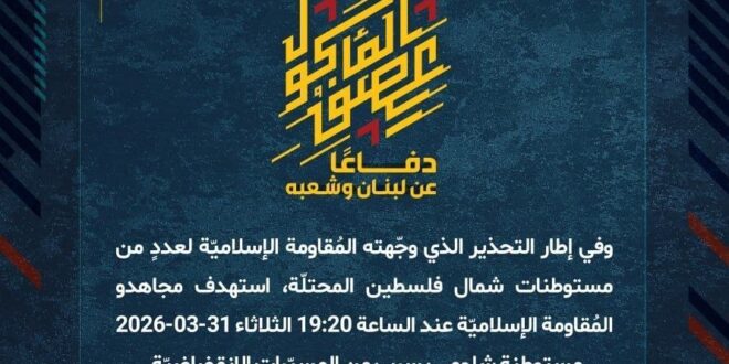 دفاعًا عن لبنان وشعبه، وفي إطار التحذير الذي وجّهته المُقاومة الإسلاميّة لعددٍ من مستوطنات شمال فلسطين المحتلّة، استهدف مجاهدو المُقاومة الإسلاميّة عند الساعة 19:20 الثلاثاء 31-03-2026 مستوطنة شلومي بسرب من المسيّرات الانقضاضيّة.