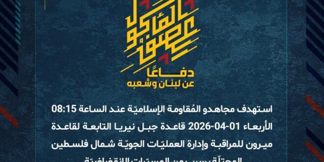 دفاعًا عن لبنان وشعبه، استهدف مجاهدو المُقاومة الإسلاميّة عند الساعة 08:15 الأربعاء 01-04-2026 قاعدة جبل نيريا التابعة لقاعدة ميرون للمراقبة وإدارة العمليّات الجويّة شمال فلسطين المحتلّة بسرب من المسيّرات الانقضاضيّة.