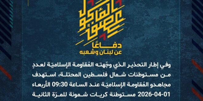 دفاعًا عن لبنان وشعبه، وفي إطار التحذير الذي وجّهته المُقاومة الإسلاميّة لعددٍ من مستوطنات شمال فلسطين المحتلة، استهدف مجاهدو المُقاومة الإسلاميّة عند الساعة 09:30 الأربعاء 01-04-2026 مستوطنة كريات شمونة للمرّة الثانية بصليةٍ صاروخيّة.