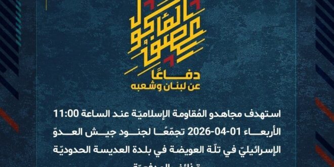 دفاعًا عن لبنان وشعبه، استهدف مجاهدو المُقاومة الإسلاميّة عند الساعة 11:00 الأربعاء 01-04-2026 تجمّعًا لجنود جيش العدوّ الإسرائيليّ في تلّة العويضة في بلدة العديسة الحدوديّة بقذائف المدفعيّة.