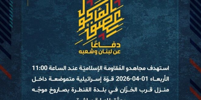 دفاعًا عن لبنان وشعبه، استهدف مجاهدو المُقاومة الإسلاميّة عند الساعة 11:00 الأربعاء 01-04-2026 قوّة إسرائيلية متموضعة داخل منزل قرب الخزّان في بلدة القنطرة بصاروخ موجّه وحقّقوا إصابة مباشرة.