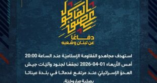 دفاعًا عن لبنان وشعبه، استهدف مجاهدو المُقاومة الإسلاميّة عند الساعة 11:15 الأربعاء 01-04-2026 تجمّعًا لجنود جيش العدوّ الإسرائيليّ في مستوطنة يرؤون بصلية صاروخيّة.