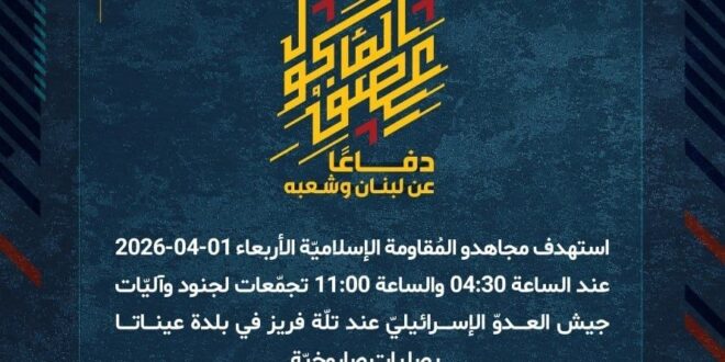 دفاعًا عن لبنان وشعبه، استهدف مجاهدو المُقاومة الإسلاميّة الأربعاء 01-04-2026 عند الساعة 04:30 والساعة 11:00 تجمّعات لجنود وآليّات جيش العدوّ الإسرائيليّ عند تلّة فريز في بلدة عيناتا بصليات صاروخيّة.