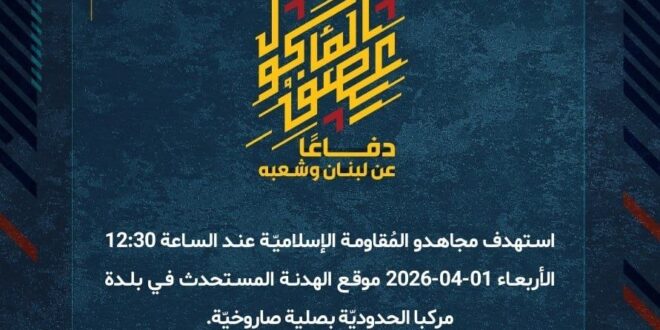 دفاعًا عن لبنان وشعبه، استهدف مجاهدو المُقاومة الإسلاميّة عند الساعة 12:30 الأربعاء 01-04-2026 موقع الهدنة المستحدث في بلدة مركبا الحدوديّة بصلية صاروخيّة.