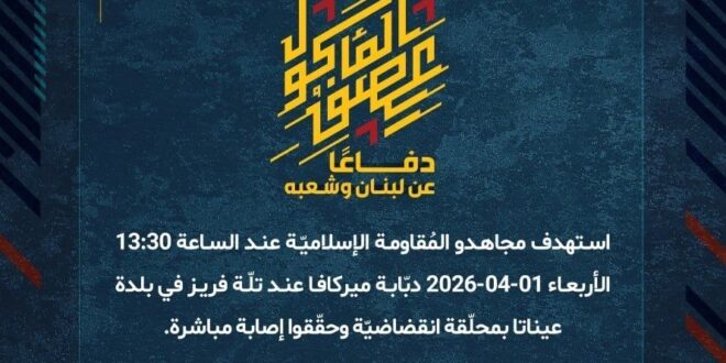 دفاعًا عن لبنان وشعبه، استهدف مجاهدو المُقاومة الإسلاميّة عند الساعة 13:30 الأربعاء 01-04-2026 دبّابة ميركافا عند تلّة فريز في بلدة عيناتا بمحلّقة انقضاضيّة وحقّقوا إصابة مباشرة.