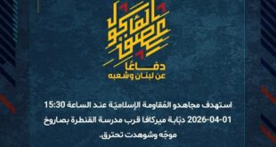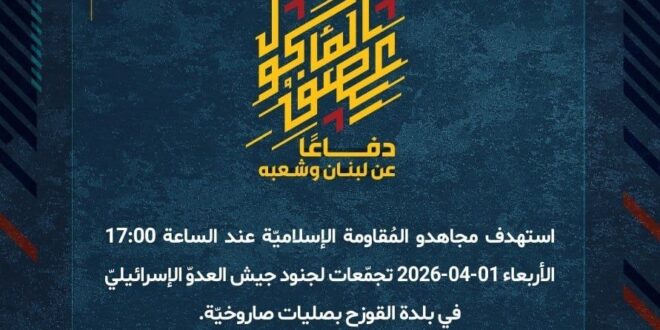 دفاعًا عن لبنان وشعبه، استهدف مجاهدو المُقاومة الإسلاميّة عند الساعة 17:00 الأربعاء 01-04-2026 تجمّعات لجنود جيش العدوّ الإسرائيليّ في بلدة القوزح بصليات صاروخيّة.