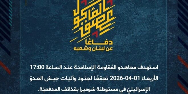 دفاعًا عن لبنان وشعبه، استهدف مجاهدو المُقاومة الإسلاميّة عند الساعة 17:00 الأربعاء 01-04-2026 تجمّعًا لجنود وآليّات جيش العدوّ الإسرائيليّ في مستوطنة شوميرا بقذائف المدفعيّة.