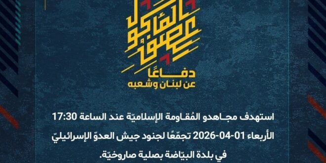 دفاعًا عن لبنان وشعبه، استهدف مجاهدو المُقاومة الإسلاميّة عند الساعة 17:30 الأربعاء 01-04-2026 تجمّعًا لجنود جيش العدوّ الإسرائيليّ في بلدة البيّاضة بصلية صاروخيّة.